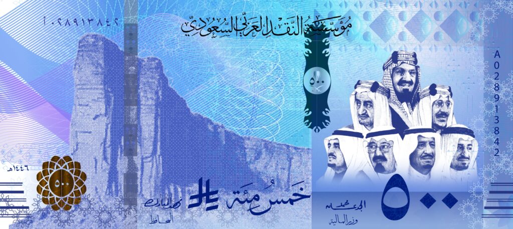 تم تصميم العملة تكريمًا لتاريخ المملكة العربية السعودية وملوكها، مع إبراز حضورهم على التصميم بشكل واضح ليعكس مكانتهم ودورهم في بناء الوطن. استُلهمت عناصر التصميم، مثل جبل طويق، من كلام ولي العهد الذي يرمز للقوة والثبات والطموح الوطني، مما أضفى على العملة بعدًا فلسفيًا ومعنويًا يعكس روح القيادة والرؤية المستقبلية. كما تم دمج مبنى البنك المركزي السعودي لتمثيل الحداثة والاستقرار الاقتصادي، ليكون التصميم مزيجًا متوازنًا بين التراث والفخامة الوطنية، ويجسد الهوية السعودية بطريقة فنية متكاملة.